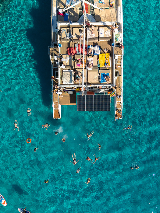 Carefully selected swimming stops allow guests to enjoy crystal-clear Mediterranean waters, with complimentary snorkelling masks available on board. Stand-up paddleboards (SUPs) provide light, fun activity close to the catamaran in calm conditions.